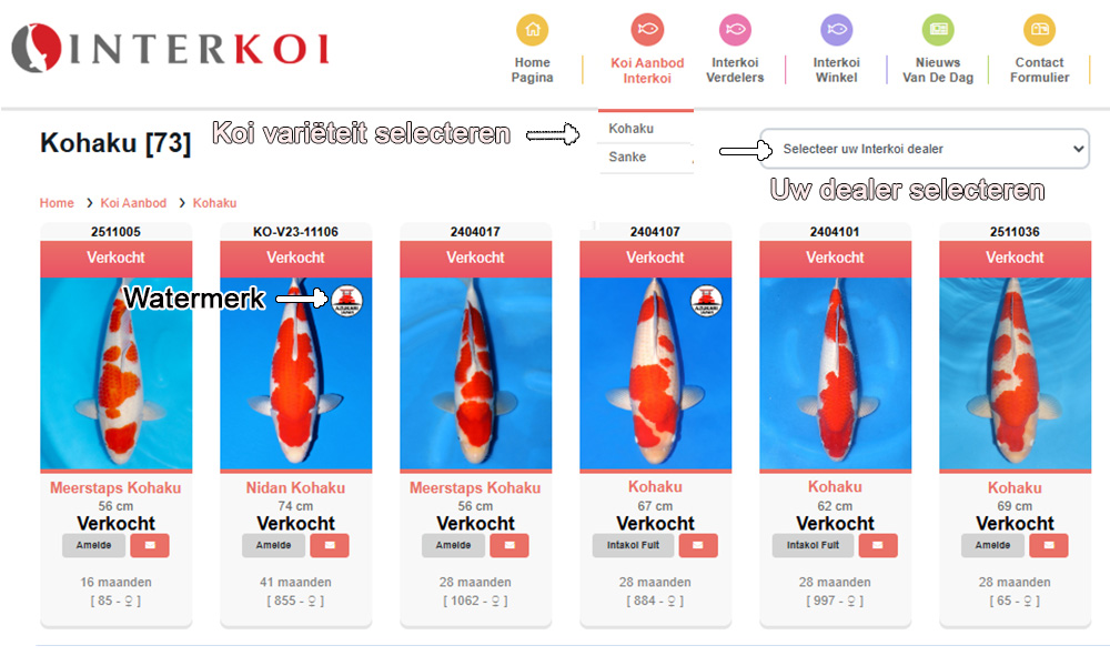 Deze koi verschijnen voortaan gewoon tussen de andere koi van hun soort, zodat je onder kohaku in één oogopslag het volledige aanbod ziet, inclusief de exemplaren die nog in Japan verblijven en voorzien zijn van het watermerk azukari. Wil je de kohaku van een bepaalde dealer bekijken, dan selecteer je in de keuzebox simpelweg kohaku en kies je de dealer die je wilt zien.