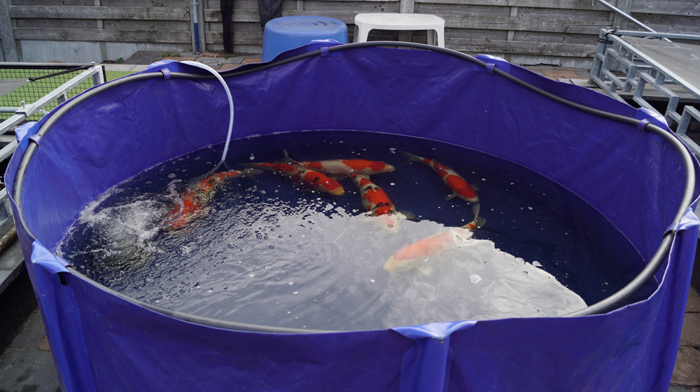 Ik had de koi ondertussen al samengezet in een vat dat ik had opgesteld. Het waren 6 serieuze nisai van 60+ ondertussen, waarvan 3 Matsue kohaku en 3 sanke van Momotaro.