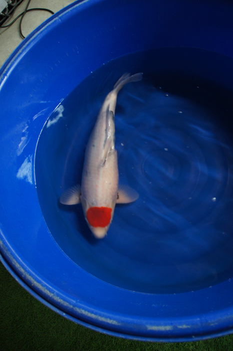 Op het filmpje zie je dan nog een kohaku van de veiling met een uitgesproken toekomstpotentieel. Deze kohaku stond voor een habbekrats te koop, als je prijs/kwaliteit vergelijkt. Er was enige onzekerheid, (niet van mij) betreffende het geslacht van deze koi. De vinpartij deed denken aan ee mannelijke koi, maar al gauw werd dit vermoeden ontkracht. Het kon ook niet anders, want ik had het al gecheckt, en deze koi werd als guarantee female verkocht op de veiling, voor mij was het antwoord zo klaar als een klontje boter.