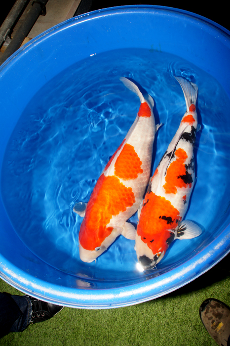 Nu weet ik eigenlijk niet wie het meeste plezier heeft om deze koi te bowlen, de omstaanders of ik, want ik geniet er altijd met volle teugen van. Je ziet hier achtereenvolgens 3 veilingsshowa van Momotaro en het zeepaardje van Matsu. De keuze was moeilijk, maar uiteindelijk werd de beslissing genomen om eigenaar van het zeepaardje te worden, een geweldige showa overigens. Na de showa zien we nog de sanke van Sakai en de sanke van Yamamatsu, gewoon een lust om naar te kijken.