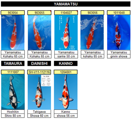 Ik geloof dat we mogen zeggen dat hier enkele bijzonder mooie koi tussen zitten, en dan heb ik het over een aantal kohaku van de 7 serie van Yamamatsu. Yamamatsu of Toshiaki Sakai is één van die kwekers, waarvan je voelt dat ze uit het goede hout gesneden zijn.